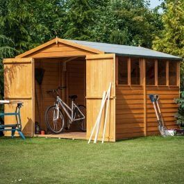 The Loxley 6′ x 12′ Double Door Overlap Apex Shed is an excellent storage building for your garden at an affordable price. The shed is constructed from overlapping boards over 34mm framing, with both the floor and roof constructed from solid sheet OSB, and the roof is covered in mineral green felt to protect the building against the elements. The building features practical double doors that allow an easy access and handling of large items, and six fixed windows that create a well lit environment. The door is fitted with a hasp and staple catch (please note that padlock is not supplied). This shed comes dip treated in honey brown finish.
